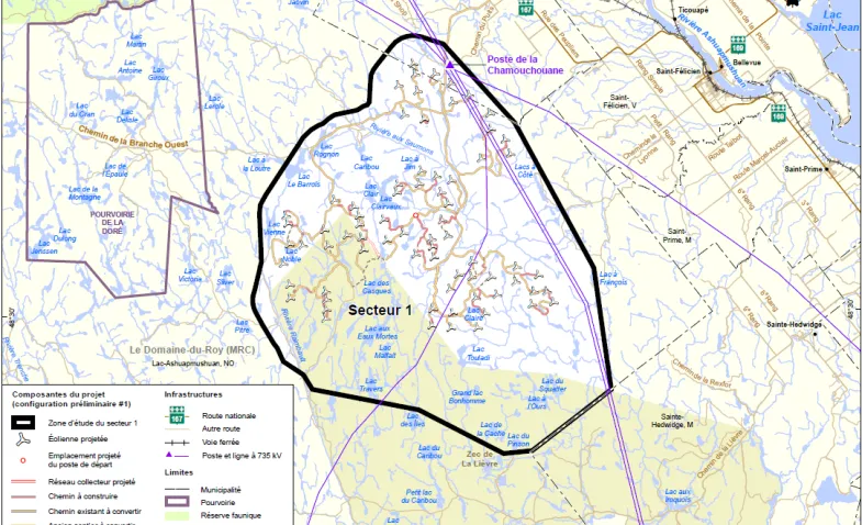 The map shows the preliminary layout of the wind turbines in sector 1 of the Utshishkau wind farm project. This area could generate 392 MW of wind power. The energy that’s produced will be sent to Chamouchouane substation.