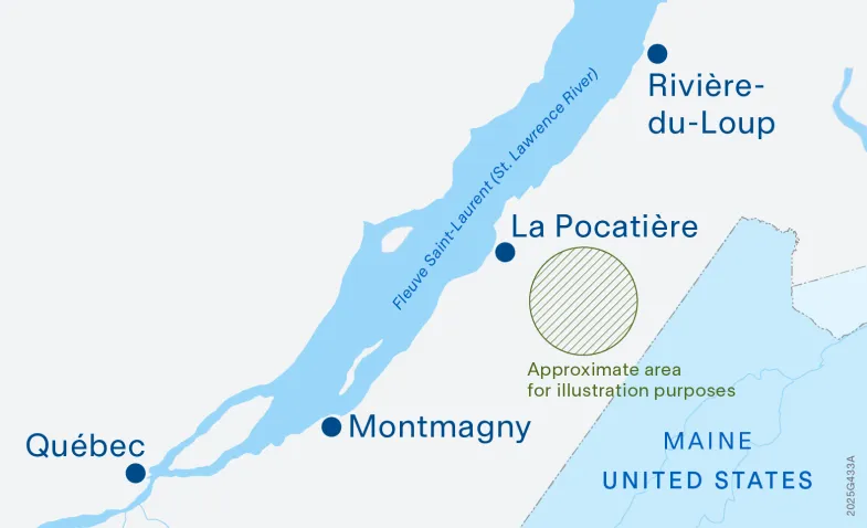 Covering approximately 700 km², the development area straddles the regional county municipalities of Kamouraska and Témiscouata. It includes the unorganized territories (TNO) of Petit-Lac-Sainte-Anne and Picard, as well as part of the Mont-Carmel and Saint-Athanase municipalities and represents a potential wind power capacity of around 1,000 MW.