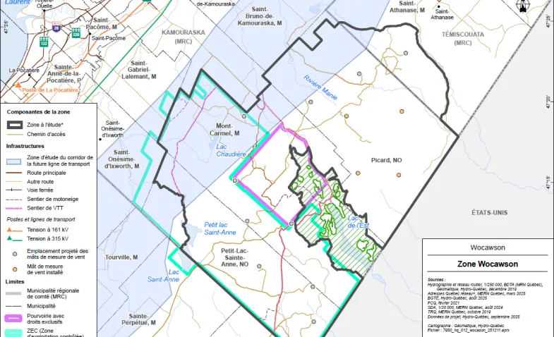 Covering approximately 700 km², the development area straddles the regional county municipalities of Kamouraska and Témiscouata. It includes the unorganized territories (TNO) of Petit-Lac-Sainte-Anne and Picard, as well as part of the Mont-Carmel and Saint-Athanase municipalities and represents a potential wind power capacity of around 1,000 MW.